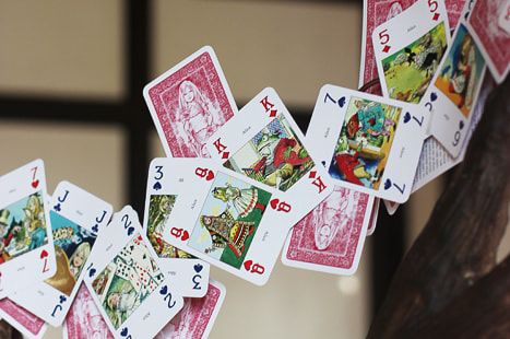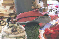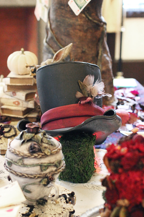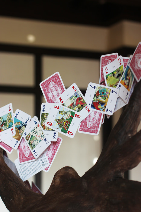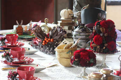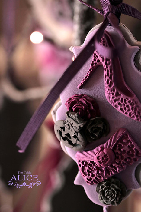 オブジェのトランプ、ハット、ティーカップ、ポット、看板、羽ペンなどはクレイアート作家・境野薫さんにオーダーし、コラボテーブルが実現しました!