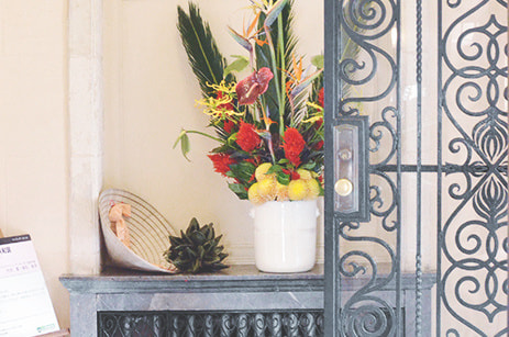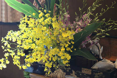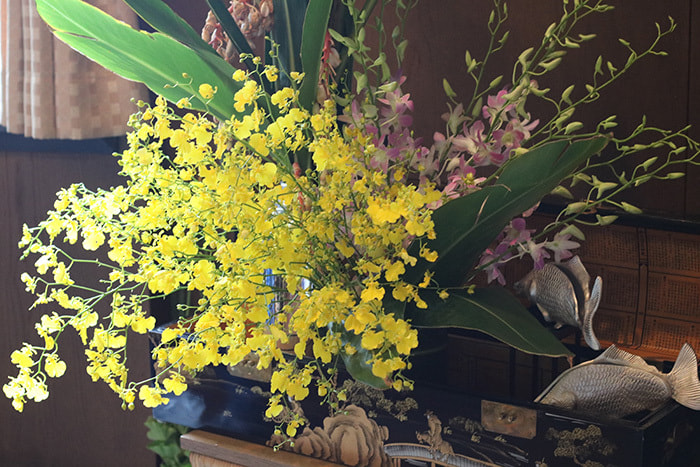 菖蒲湯はその昔蘭湯でした。花は蘭を中心に厄除けの月桃を使っています。