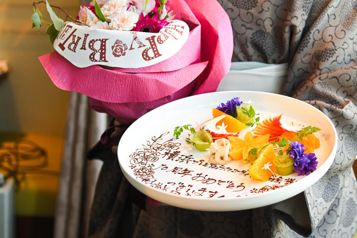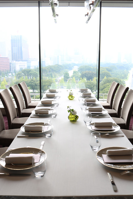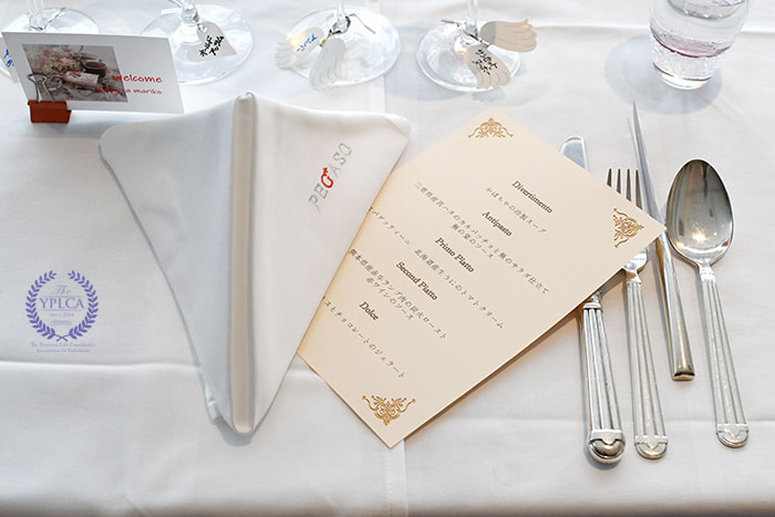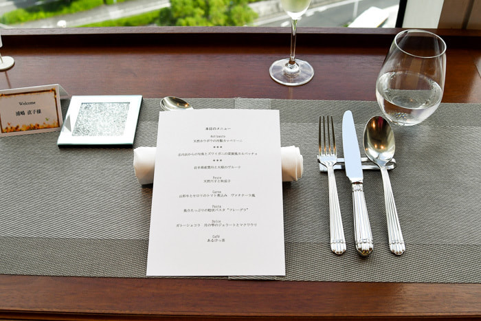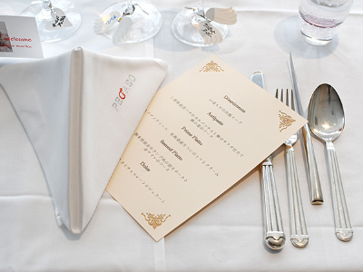 ハンゾウヤさんのバンケットルームを貸し切りにしていただきました。打ち合わせを重ねた季節のコースはアミューズ、スープ、フィッシュ、ミート、チーズ、デザート。お飲み物も含めて特別なコースメニューをお願い致しました。テーブルはフルコースのセッティング。