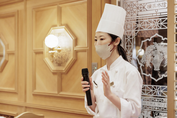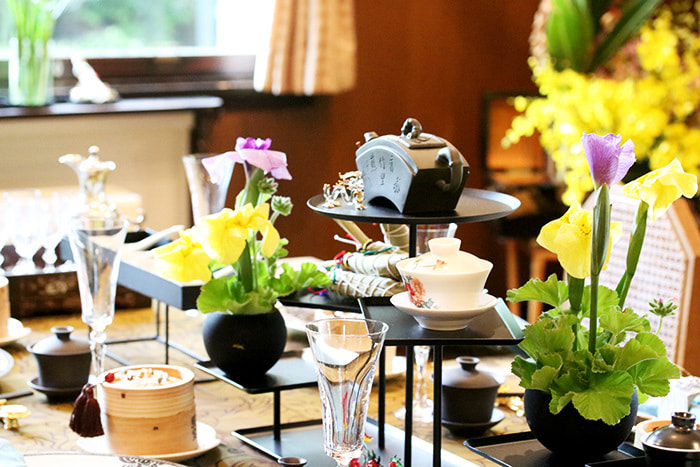 - テーマは「贅沢フルーツのハイティーパーティー」何度か打ち合わせさせていただきご用意いただいたメニューは、キュウリのサンドイッチやキッシュロレーヌなどのセイボリーからはじまり、4種のプチスイーツ、焼きたてのスコーン、最後にパフェで締めくくるコース仕立ての豪華なメニュー。なんと19種類ものフルーツを使った大変贅沢なハイティーにはご参加の皆さまも大感激!今回のメインである、ハイティーをより愉しむ為の学びとして、紅茶業界で知らない人はいないトップブレンダー内田智子氏(㈱沖縄ティーファクトリー・代表)から紅茶のテイスティング方法のレクチャーや、3種の異なる紅茶のペアリング体験をしていただきました。ご参加された方から、「紅茶の繊細な味わいや香りの違いを感じながら、お料理を一緒に堪能しました」と感想をいただきました。スタッフの皆様の心を込めたホスピタリティなサービスにも感動でした。最後は水信グループの加藤社長にご挨拶いただき、発売前の水信ブレンドティー<インダストリアルデザイナー水戸岡鋭治氏デザイン容器>を先行予約できるサプライズもありました。