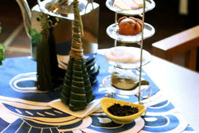 健やかな健康を願い、瓦の上の鯉のぼりをテーブルに。粽と柏餅の行事食に季節の食材を取り入れたメニュー。香りのよいものに厄除けの意味があります。